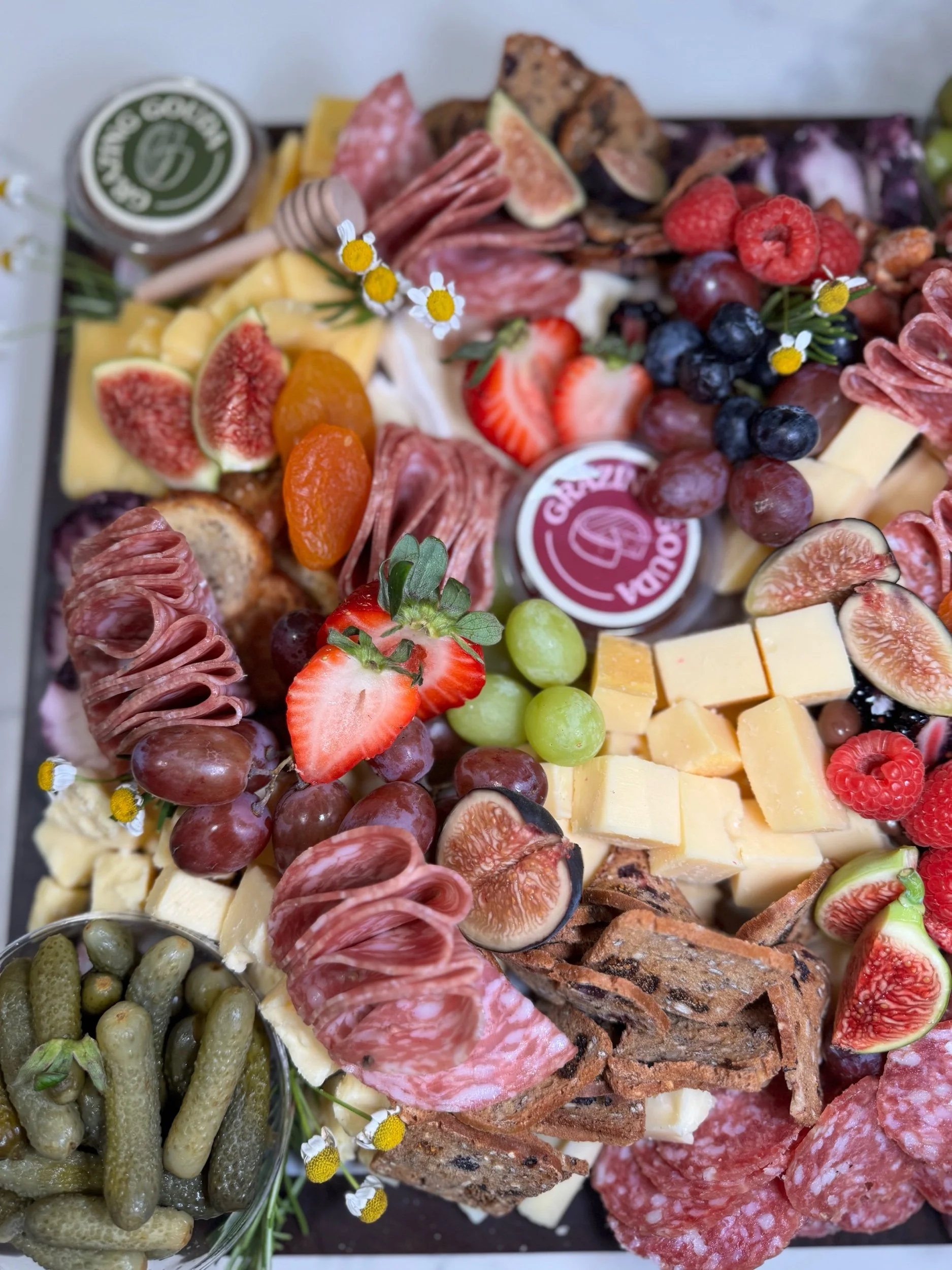 All arrangements are meticulously and lovingly curated, ensuring that every detail is carefully considered. The use of local, seasonal ingredients adds a beautiful touch, and the selection includes a delightful assortment of artisan cheeses, carefully chosen charcuterie meats, fresh and succulent fruits, as well as a variety of olives and cornichons. Completing the ensemble are homemade jams, exquisite honey accompanied by a dipper, artisan crackers, and a tantalizing array of sweet and savory accoutrements.